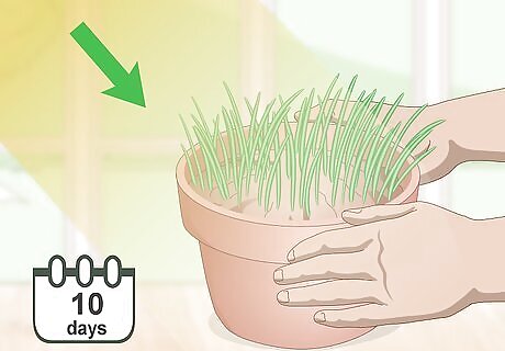 Move the pot, so it gets natural light and waits ten days for the sprouts to grow. Set the pot in an area of your home that gets direct and indirect sunlight throughout the day, such as a windowsill. After about ten days, the grass will be fully grown and ready for your cat to chew on.