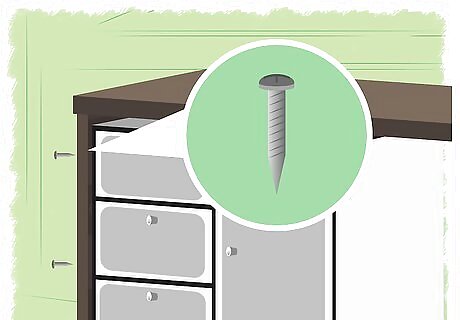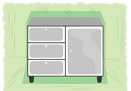 Replace the back, if necessary. If the back of the dresser is unsightly or damaged, replace it by cutting or having cut a custom-sized piece of MDF or particleboard. Carefully remove the old one and then nail the new one into place. You can add usability to the back by painting it with chalkboard paint to create a blackboard for writing grocery lists or as doodle space for the kids. Another way to use the space would be to screw hooks or bars into and solid, stationary sections on the other side of the backing. These can be used to hang kitchen towels, paper towels, oven mitts, or kitchen tools.
