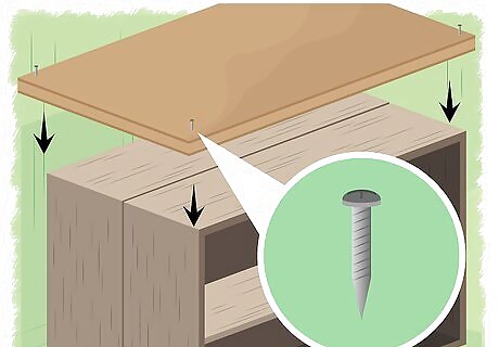 Attach the cabinets to the desk. Attach these by screwing from the inside of the cabinets or shelves into whatever part of the main island they are touching, as well as each other if there is any wood thick enough. Be sure to use only screws which go no further than halfway through the wood panel, as any further may split, warp, or puncture the outer surface.