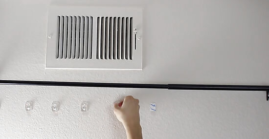 Place the Command hooks under the curtain rod. After your curtain rod is in place, you will need to secure the Command hooks. You will need the Command hooks to hang the mini lights. Place your Command hooks about an inch under the curtain rod. To secure the Command hooks, take an adhesive strip and then remove the protective covering from the “wall” side. Press the wall side of the adhesive firmly against the wall. Then, remove the other protective cover and press the “Command hook against it for about 30 seconds. Repeat this process with all of the hooks. Make sure that you keep the hooks on an even level and that you space them out evenly as well.
