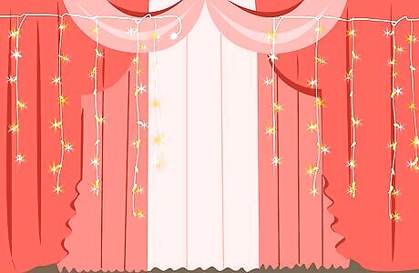 Arrange the curtains. To ensure that your headboard will look just how you want it to, take some time to arrange the curtains. You can fan them out or bunch them together in different ways to change the texture of your headboard. As you arrange your curtains, make sure that the mini lights stay hanging straight down against the wall.