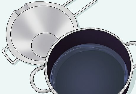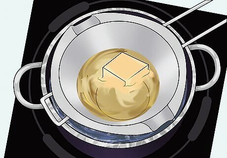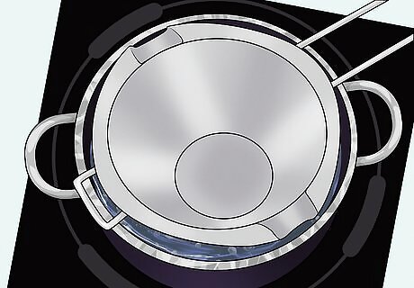 Set up your double boiler or create your own at home. If you don’t own a double boiler, make one using a pan filled halfway with water, topped with a non-combustible bowl. For best results use a tin bowl instead of glass (to avoid the possibility it could shatter during the cooking process). Turn the heat to low or medium low to allow the water to simmer.