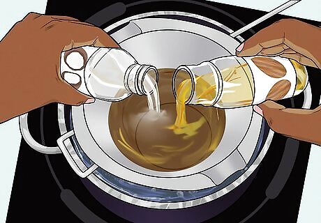 Add ½ cup of almond oil and ½ cup of coconut oil as the beeswax is beginning to liquefy. As you add the oils, stir slowly to integrate the oils into the beeswax.