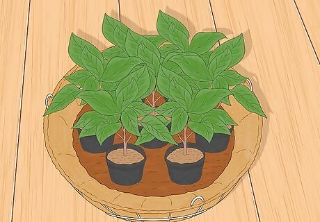 Remove the flowers from their containers once you've set the arrangement and plant them inside the basket.