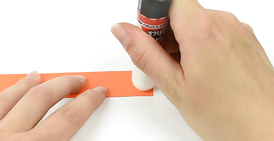 Glue together 2 sets of strips to make 2 individual pairs. Take 2 orange strips of paper and use the glue stick to glue the short ends together, so that it forms a strip that is double in length. Then repeat this process with another 2 strips to make a second pair. These strips are the foundation for your paper pumpkin.