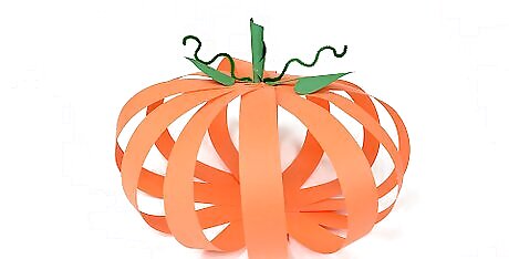 Add embellishments to your pumpkin to make it more decorative. There are plenty of ways to get more creative with your paper pumpkin! Try adding a small, novelty spider or spider web to the orange strips. You may need to use a hot glue gun for this. Alternatively, you could add leaves to your pumpkin by drawing 2 leaves on green paper, cutting them out, and then gluing them to the stem.
