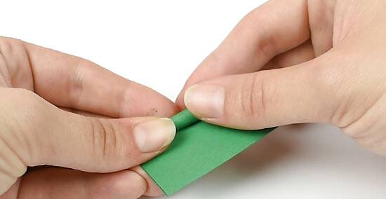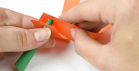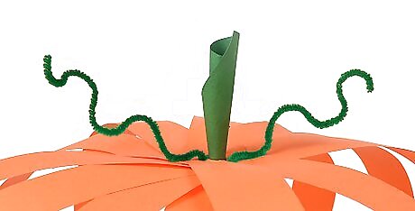 Roll the green paper into a cylinder with a smaller end. Take the small, 2 in × 2.5 in (5.1 cm × 6.4 cm) piece of green paper and roll it into a tight cylinder. Make sure that one end is slightly smaller in diameter than the other end and check that the smaller end can fit through the holes that you made in the orange strips. If the thinner end of the cylinder cannot fit through the holes, roll it more tightly. This is the pumpkin stem.