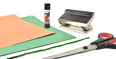 Get construction paper, scissors, glue, a hole punch, and a green pipe cleaner. It can be helpful to set out all of your supplies before you begin making your pumpkin so that you have everything ready. You can find all of these craft tools and supplies at craft stores or department stores. You may even already have most of these tools at home! You’ll need 1 sheet of 9 in × 12 in (23 cm × 30 cm) orange construction paper and 1 small rectangle of 2 in × 2.5 in (5.1 cm × 6.4 cm) green paper. Alternatively, if you don’t have construction paper you can use 2 sheets of A4 paper as a substitute for 1 piece of orange construction paper. You can use either construction paper or A4 paper for the small green rectangle. If you don’t want to make a traditional, orange pumpkin, you can experiment with paper of other colors and patterns! Use scrapbooking paper or a different type of craft paper to try out different textures, colors, and designs. A glue stick is the best option for this project. The green pipe cleaner is for making the pumpkin’s tendrils.