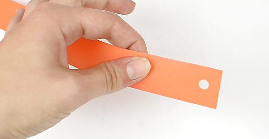 Use the hole punch to make a hole in each strip. Lift 1 strip and place the end into the hole punch. Aim for the hole to be approximately ⁄2 in (1.3 cm) away from the end of the strip. Press the hole punch down firmly to cut a hole and work your way around all of the strips so that each one has 1 hole at the end.