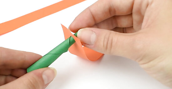 Insert the tendrils into the hole at the base of the pumpkin stem. Get the paper pumpkin and carefully push the end of 1 pipe cleaner half into the space where the stem and the paper strips meet. Then repeat this for the second tendril. Be very careful to not accidentally rip the paper. If it’s too difficult to fit the tendrils in by the stem or if you’re worried about the paper ripping, simply glue each tendril to the base of the stem. It will look just the same.