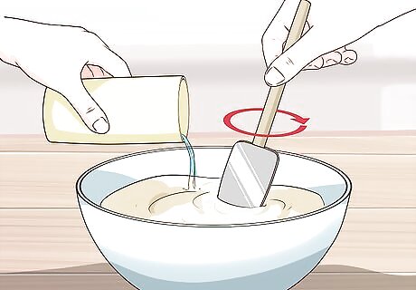 Stir in the water until the mixture turns to dough. Pour in a little bit of water, and stir it in with a rubber spatula. Stir in some more water, and mix again. You may end up using up to 1 cup (240 milliliters) of water. Avoid using too much more, or the dough will turn out too sticky.