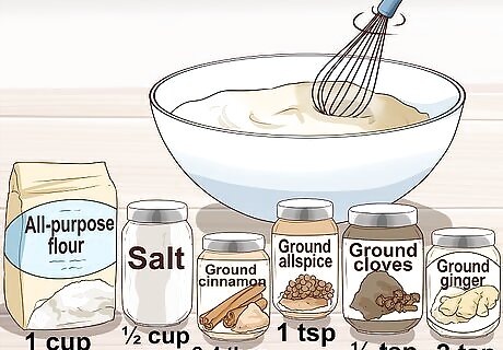 Mix together the dry ingredients. Pour 1 cup (100 grams) of all-purpose flour into a large mixing bowl, then add ½ cup (150 grams) of salt. Next, add 2 to 4 tablespoons of ground cinnamon, 1 teaspoon of ground allspice, ½ teaspoon of ground cloves, and 2 teaspoons of ground ginger. Stir them together with a whisk until they are all evenly combined.