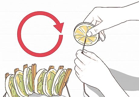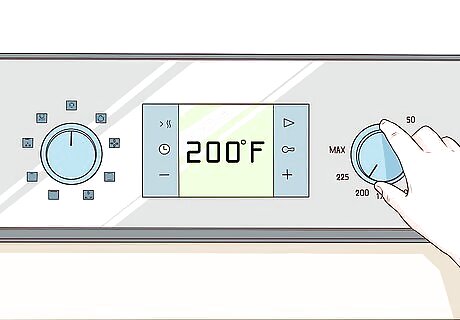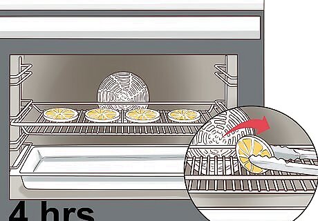 Bake the oranges in the oven for 4 hours, turning them every hour. You can place them directly onto the rack in the oven. Avoid using a baking sheet, as this will trap too much moisture and will prevent the orange slices from drying out properly. Every hour, use a pair of tongs to turn the orange slices. If you'd rather not dirty up your oven, place a metal rack on top of a baking sheet, then place the orange slices on the rack.