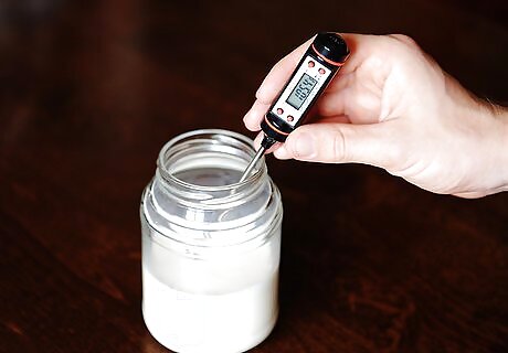Pour the milk into a jar and shake it. Add ½ cup (118 ml) of non-fat milk to a jar that has a lid. Close the lid, and shake the jar vigorously until the milk becomes frothy and doubles in volume, which should take approximately 30 to 60 seconds. Make sure that the lid is on the jar tightly before you shake it so you don’t wind up spilling milk all over your kitchen.