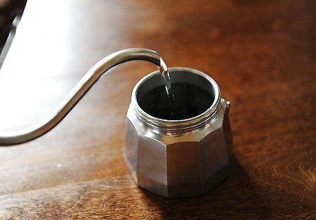 Fill the moka pot with water. The bottom portion of the moka pot is the water tank. Unscrew it from the top portion, and add 2 cups (474 ml) of fresh, cold water to it. Most moka pots have a fill lines that indicate how much water to add based on how much espresso you want to make. Consult the instruction manual for your pot to see if there are guidelines if you want to adjust the amount.
