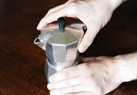 Close the pot and place on the stove to brew. Once you've added the ground coffee, place the top on the pot. Set it on your stove, and turn the burner to high. The coffee will need to brew for 5 to 10 minutes -- you'll know that it's finished when the pot makes a loud gurgling sound. If you have a gas stove, you may not need to use high heat. Experiment with the settings to determine what works best. If you have an induction stove, you'll need a specialty moka pot.