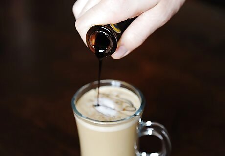 Garnish the latte with more syrup if desired. After you’ve topped the latte with the foam, you can add more of the flavored syrup. Add up to ½ tablespoon (7 ½ ml) over the foam to increase the flavor. You can squeeze the syrup in stripes, zig zags, or even a swirl over the top of the latte to give it a more decorative look.