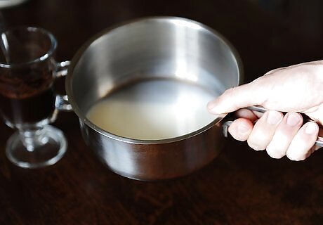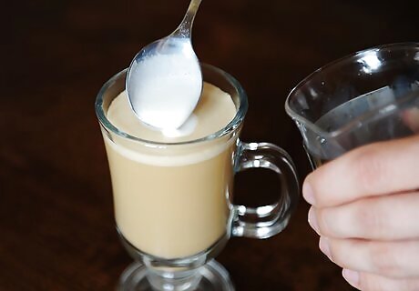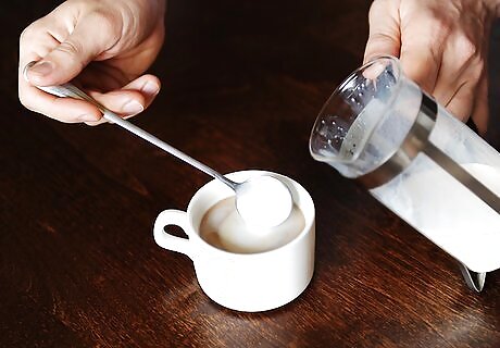 Combine the espresso and milk in a mug. Fill a wide, shallow coffee mug with approximately 1 cup (237 ml) of hot espresso. Pour as much of the milk into the espresso as you’d like, using a large spoon to hold back the foam. Lattes are traditionally made with espresso, but if you don’t have an espresso machine or moka pot, you can make an extremely strong cup of regular coffee to use.