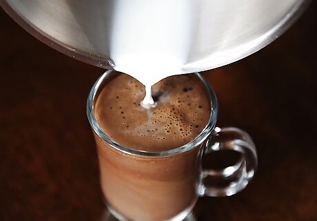 Pour the milk into the espresso. After you’ve warmed the milk, add it to the espresso and chocolate mixture. You can add as much or as little as you’d like.