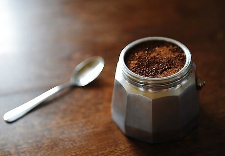 Add the coffee grounds to filter. Place the filter portion of the pot over the water tank. Fill the filter with 2 ½ tablespoons (16 g) of espresso grind ground coffee. Don't press the coffee down, but you can smooth it with a spoon to ensure that none of the grounds spill out of the filter. You can use pre-ground coffee or grind your own beans, depending on your preference. Depending on the coffee that you use, you may want to adjust the amount of grounds that you use. Experiment to determine the best amount for the flavor that you like.