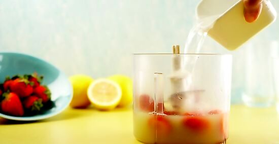 Add in the lemon juice, strawberries, honey, sugar, and water into the blender. If you'd like, you can cut out the sugar or add handfuls of other fruits into the smoothie as well.