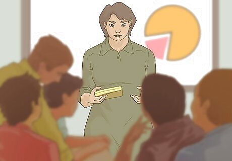 Don't hand out material while presenting a visual aid. If you plan on presenting any information using a visual aid, do not distribute information or handouts at the same time. This can cause your audience to become distracted and possibly miss some of the information being presented. Hand out any materials before or after using a visual aid. Keep the audience focused on the visual aid when it is being presented.