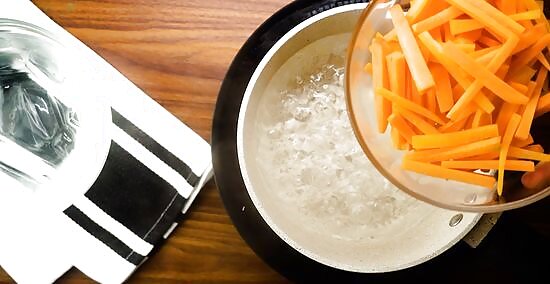 Blanch your food for 2 to 5 minutes. Boil about 1 pound (450 g) of chopped vegetables until they turn bright in color. Since the texture and density of vegetables varies, follow a blanching guideline. In general, boil: Green beans or broccoli florets for 3 minutes Diced carrots or pepper strips for 2 minutes Cauliflower florets for 2 minutes