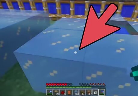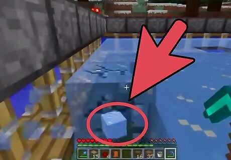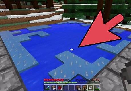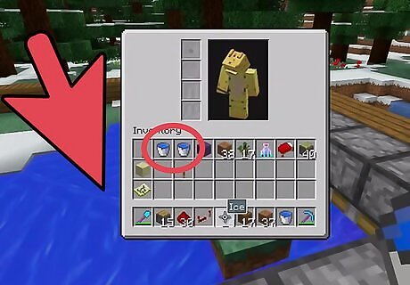 Build a farm using a 5x5 area. This method is a bit more streamlined, but takes an area of at least 5x5 blocks. First, dig a square of land about 3x3 blocks big and 2 blocks deep. Fill the bottom of the hole with water until the whole pool is still. You can gather water with your bucket; just go up to some water with your bucket equipped, and select the water. The easiest and least time- and resource-consuming way of filling up your pool is by selecting your filled bucket again to place the water on the four corners of the pool. You can also craft multiple buckets and then fill them with water to minimize the effort of gathering water, but only if you have enough resources to do so. Slowly place some blocks in an alternating pattern around the top of the pool, which would cover strategic parts of the pool to keep it from freezing entirely. It should look a bit like this: b = base block (dirt, cobblestone, sandstone, etc). w = water X = blank space Pool: b b b b b b w w w b b w w w b b w w w b b b b b b Cover Layer: b b b b b b b X b X b X X X X b b X X X This method is more efficient since it covers certain areas, so that when the ice is harvested, the water flows back in without danger of running out, making the ice an infinitely renewable resource.