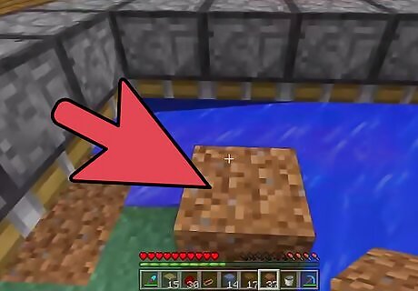 Build a farm using a trench. The last method is yet another variation of this simple system, but streamlines the process even further and removes the possibility of errant flow patterns due to its design. Basically, you create a trench about 3 blocks wide and however long you want. Then fill in the trench with water. One way you can do this quickly is to place water at the corners of your pool then every two or three blocks along the trench, you place your water at the middle until you reach the end. At 2 blocks above your trench, create a capital I shape like so: Pool b b b b b b w w w b b w w w b b w w w b b w w w b b w w w b b w w w b b w w w b d d d d d Cover Layer (must be two blocks above bottom of pool) X X X X X X b b b X X X b X X X X b X X X X b X X X X b X X X X b X X X b b b X X X X X X This streamlines the process considerably without using redstone, but also ensures the production is faster and more efficient than the first two methods.