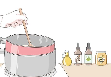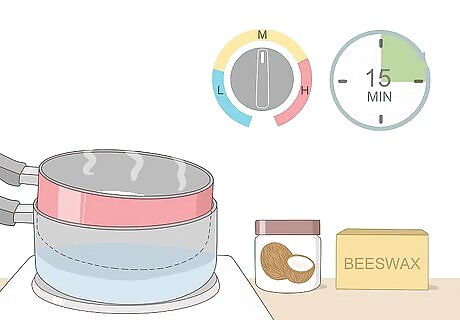 Melt the coconut butter and beeswax together. Prepare a double boiler, or create a makeshift one by filling a large pot with a few inches of water and setting a smaller pot inside. Heat the boiler over medium high heat, until the water starts to simmer. Place the 3 tablespoons (44.4 ml) coconut butter and 1 tablespoon (14.8 ml) beeswax in the smaller pot. Stir until the mixture melts, and keep heating it for 15 minutes so it won't get grainy. It's important to melt the mixture slowly to ensure it doesn't burn.