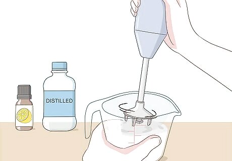 Whip the mixture with a hand blender. Add 2 tablespoons (29.6 ml) filtered or distilled water and 10 drops of orange, lemon or lime essential oil as you continue to blend. The body butter will turn thick and white as you blend. Keep going until it's creamy and rich in texture. The process of beating the melted oils with water is called emulsifying. It's similar to the process of making whipped cream or mayonnaise. It might take awhile for the mixture to come together, so keep at it until you achieve the right texture.