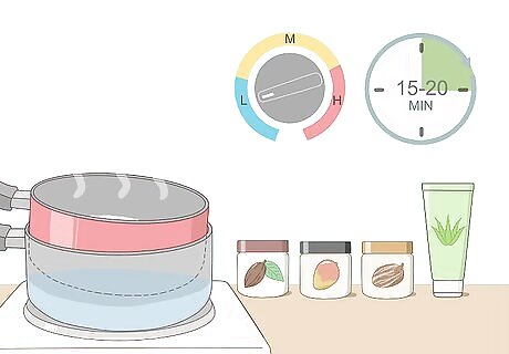 Melt them together. Prepare a double boiler, or create a makeshift one by filling a large pot with a few inches of water and placing a smaller pot inside it. Place all of the ingredients except the essential oil into the smaller pot. Turn the burner on low and heat the mixture, stirring occasionally, until the ingredients are completely melted. Continue to heat the mixture for 15 to 20 minutes, stirring occasionally, until the oils are completely incorporated and the body butter is smooth with no graininess. Be sure not to heat the ingredients too quickly, since this could ruin the texture of the different butters. Melt them together slowly, stirring often to make sure the mixture doesn't scorch.