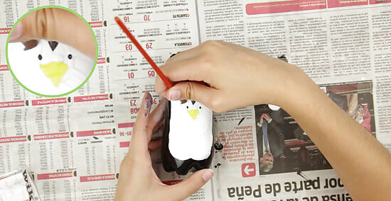 Paint 2 eyes and a beak using acrylic craft paint. Use a yellow upside-down triangle for the beak, and 2 black dots for the eyes. For a more realistic beak, paint a yellow or orange circle, then draw a horizontal black line going through the middle. Look at pictures of cartoon penguins to get ideas. You can also hot glue 2 buttons or 2 googly eyes for the eyes. If you don't have yellow paint, cut a triangle out of yellow paper, and glue that on instead.