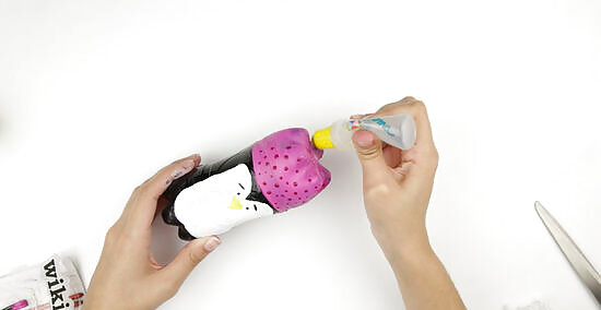 Glue the bottles together, if desired. If the bottles are loose, glue them together with tacky glue or super glue. Pull the bottles apart, and paint the inside rim of 1 bottle with glue. Slide it over the other bottle. Hot glue is not recommended because it is too bulky. Alternatively, you can keep the bottles loose, and use the penguin as a gift box.