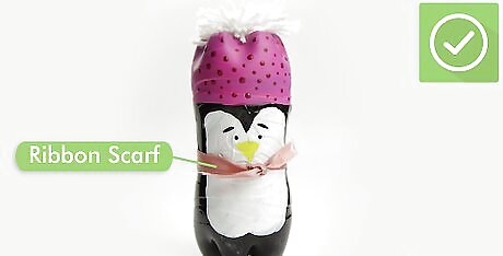 Tie ribbon around the neck to make a scarf. Find some ribbon that goes well with the hat. Wrap the ribbon around the penguin's neck, then cross the left end over the right end. Bring the left end up through the gap, then tighten it. This is just like starting to tie a pair of shoes! Glue both ends of the ribbon to the penguin so that they stay down. If you are turning this into a gift box, make sure that you keep the ribbon below the seam. You can also cut a long, skinny strip out of felt, and use that instead of ribbon. Cut fringes into each end for additional charm.