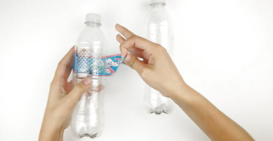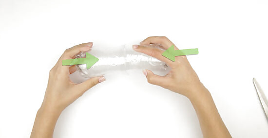 Tuck 1 bottle inside the other to make a capsule. Turn the bottles so that the cut edges are facing one another. Slide the first bottle into the second bottle by about ⁄2 to 1 inch (1.3 to 2.5 cm). If the bottles won't fit inside one another, cut a ⁄2 to 1 in (1.3 to 2.5 cm) slit into 1 of the bottles first; place this edge on the inside. Make sure that the 4 bumps on the top and bottom of the capsule line up.