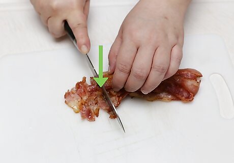 Cut your bacon into pieces. Take your crisp bacon or bacon substitute and place it on a cutting board once it’s cooled. Chop the bacon into small one inch (2.54cm) pieces using a sharp knife. Set the chopped bacon aside once you’re done.