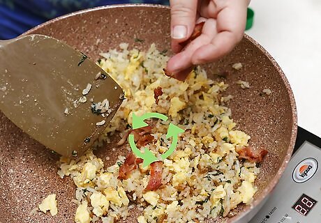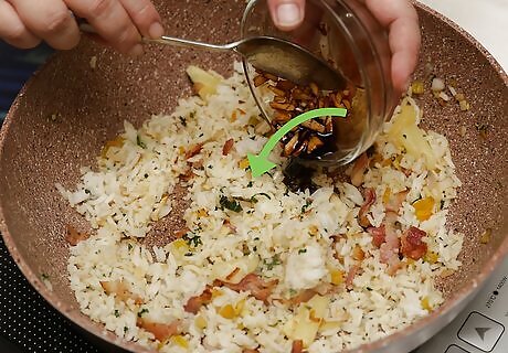 Add soy sauce, sesame oil and bacon bits to the rice. Combine 3 tsp. of soy sauce, 2 tsp. of sesame oil, and bacon bits to your pan and continue to mix all of the ingredients together until well incorporated. Once all the ingredients have been evenly distributed throughout the rice, you can remove it from the pan and serve.