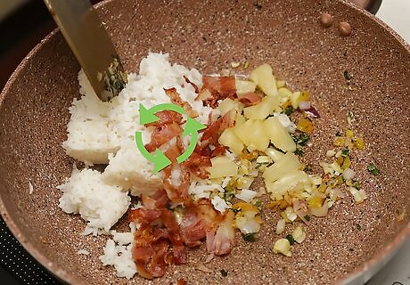 Add rice, pineapple, and bacon to the pan and stir. Combine your cooked rice and chopped pineapple your pan of vegetables. Continue to cook everything over medium-high heat for 5-7 minutes or until the ingredients are heated through. You will know this when they begin to steam.