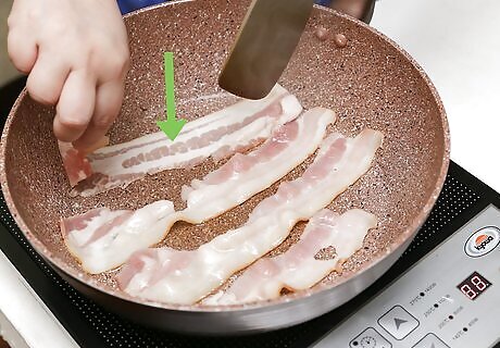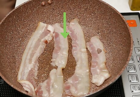 Cook your bacon. In a pan or skillet, cook your bacon over medium heat until it becomes dark and crispy. This process should take around 10 minutes. Set the bacon aside on a plate lined with paper towel to absorb the grease. When you're done cooking the bacon, leave around 2 tsp (9.8 mL) of bacon fat in the pan. You can use this fat later to cook the other ingredients. If you are a vegetarian, you can pick up tempeh bacon, which is a non-meat based product that replicates the taste of bacon as an alternative. Another non-meat based alternative to bacon is oven baked shitake mushrooms with salt. You can also replace bacon with ham or breakfast sausage.