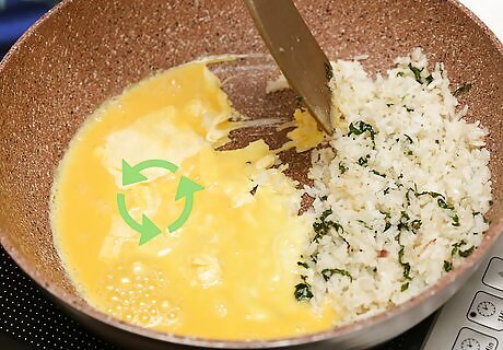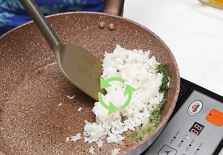 Add the rice to the pan and brown it. Add the rice to your pan and mix it together with the scallions. Break up any larger chunks of rice and continue to stir the pan for 3-5 minutes, or until the rice has slightly browned. Once you’ve finished heating the rice, move it to one side of the pan. When steam starts coming off the rice, it should be fully heated.
