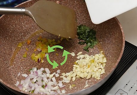 Add the red onion, green onions, garlic, and bell pepper to the pan. Once your oil is hot, add the onions and other ingredients to the pan. Continue to mix and cook the ingredients on high heat for two minutes. Lower your burner to low-medium heat until they become fragrant and the bell pepper becomes tender. This should take anywhere from 5 to 8 minutes.