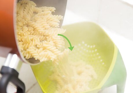 Drain the pasta when it is done cooking. Take the pot off the stove, and carry it over the sink. Pour the water and pasta through a colander or strainer.
