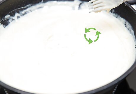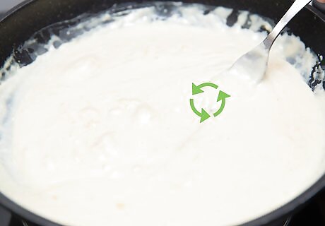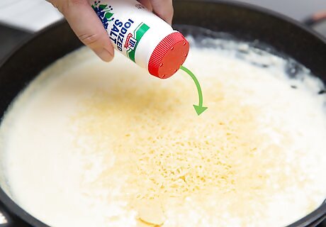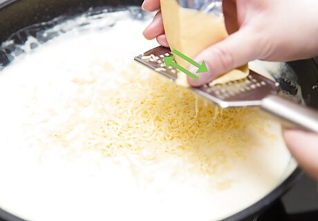Reduce the heat to low and add in 2 to 3 cups ( 200 to 300 grams) of shredded cheese. You can use any type of shredded cheese you like. Cheddar, Colby, and Monterey Jack are popular flavors. If you are using a hard cheese, such as Romano or Parmesan, make sure that it is finely-grated. This will help it melt better.