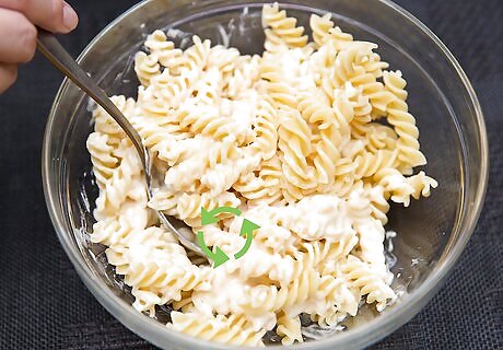 Stir the two together until the pasta is evenly coated. Use a large spoon or spatula. Try to use a rolling motion, where you bring the pasta from the bottom of the bowl to the top.