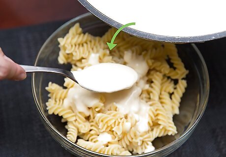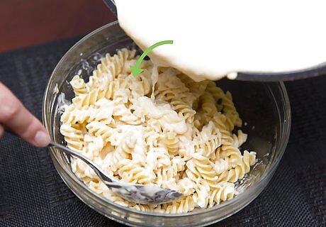 Put the pasta into a large serving bowl. Choose a bowl that is a little bit larger than you think it needs to be. This will make mixing the pasta and sauce a lot easier. It will help prevent any bits of pasta from escaping.
