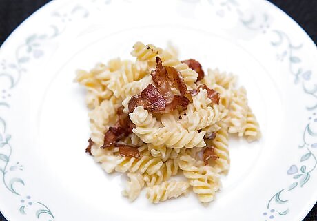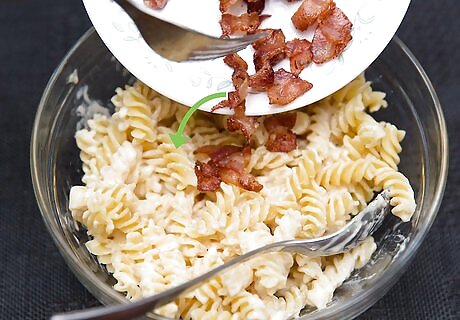 Consider adding in some extras. At this point, you can add in some extras to give your pasta some extra flavor. What ever you choose to add in should already be cooked and cut into small, bite-sized pieces (or smaller). Here are some ideas for popular add-ins: Bacon or ham Broccoli Cauliflower Mushrooms and onions Peas and carrots Peppers