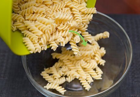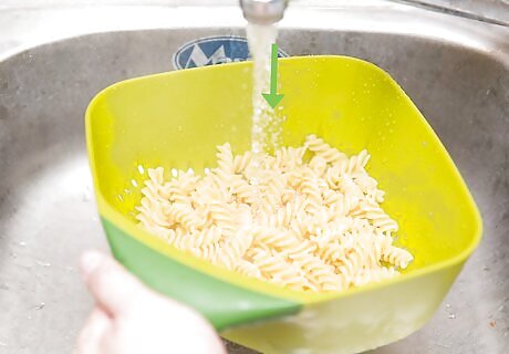 Run the pasta under cold water, then set it aside. Once you have drained the pasta, keep it in the strainer, and run it under cold water for a few seconds. This will stop the pasta from cooking and turning mushy. Give the strainer a jiggle to get rid of any excess water, then set the pasta aside.