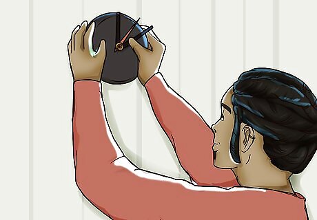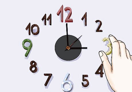 Hang the numbers and set the clock. Use the adhesive putty to hang the 12, 3, 6 and 9 on the pre-marked pencil spots. You can then use a ruler and pencil to space out and mark off where the rest of the numbers will hang. Use the adhesive putty to hang the remaining numbers. Adhesive putty is easily removable, so if you need to adjust the placement of a number, you can easily remove it from the wall and remount it somewhere else. Insert any batteries the clock mechanism may require and set the clock to the correct time.