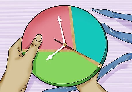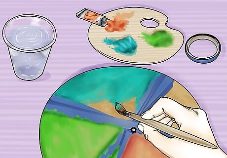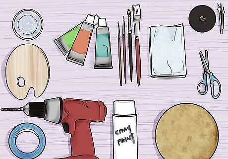 Gather the supplies. To make this clock, you will need the following materials: 1 cork trivet, 1 hanging clock kit, 3 contrasting paint colors, white spray paint, a power drill, painter’s tape, paint brushes, scissors, a mixing palette, a water cup and paper towels. If you don’t have a palette, you can use a paper plate instead. Try to choose paint colors in very bright colors.